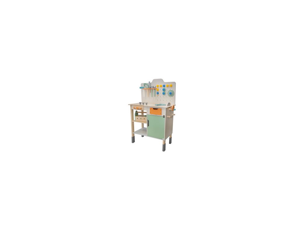 Dílna je vyrobena z hladkého MDF dřeva, malovaného netoxickými barvami splňujícími normy EN71. Každý prvek je navržen tak, aby byl bezpečný i pro malé dětské ručky – zaoblené hrany, stabilní konstrukce a pevné uchycení dílů zaručují dlouhou a radostnou hru.
