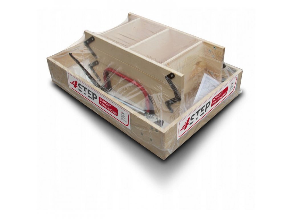 Obdržíte kompletní schodiště (krabici, klapku se zámkem, žebřík, kování) včetně tyče pro otevření zámku.