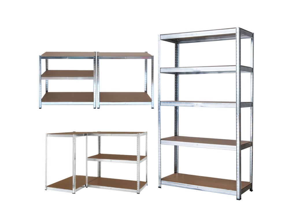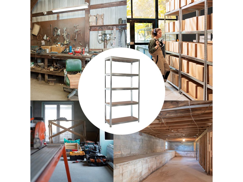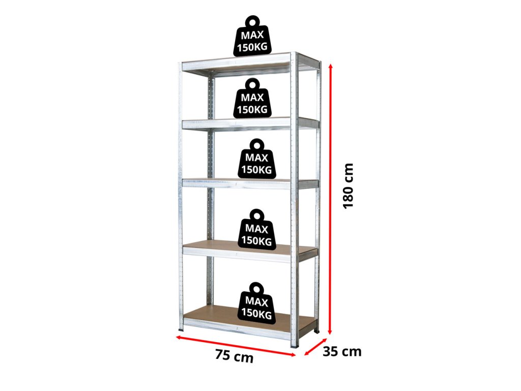 Tento kovový regál s 5 policemi nabízí dostatek prostoru pro uložení nářadí, krabic, sklenic nebo sezónních doplňků. Každá police z MDF desky (5 mm) unese až 150 kg, takže celková nosnost činí 750 kg.