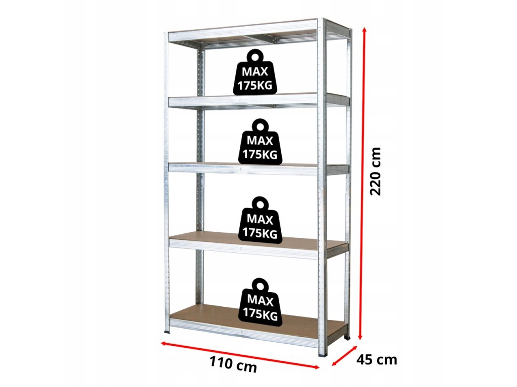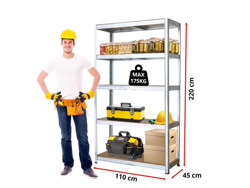 Tento kovový regál s 5 policemi nabízí dostatek prostoru pro uložení nářadí, krabic, sklenic nebo sezónních doplňků. Každá police z MDF desky (5 mm) unese až 150 kg, takže celková nosnost činí 750 kg.